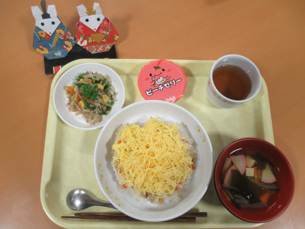 給食は、ひなまつりランチ♪ ◦ちらしずし ◦菜の花あえ ◦かまぼこのすまし汁 ◦ももぜりーで、春らしいメニューをみんなでおいしくいただきました。