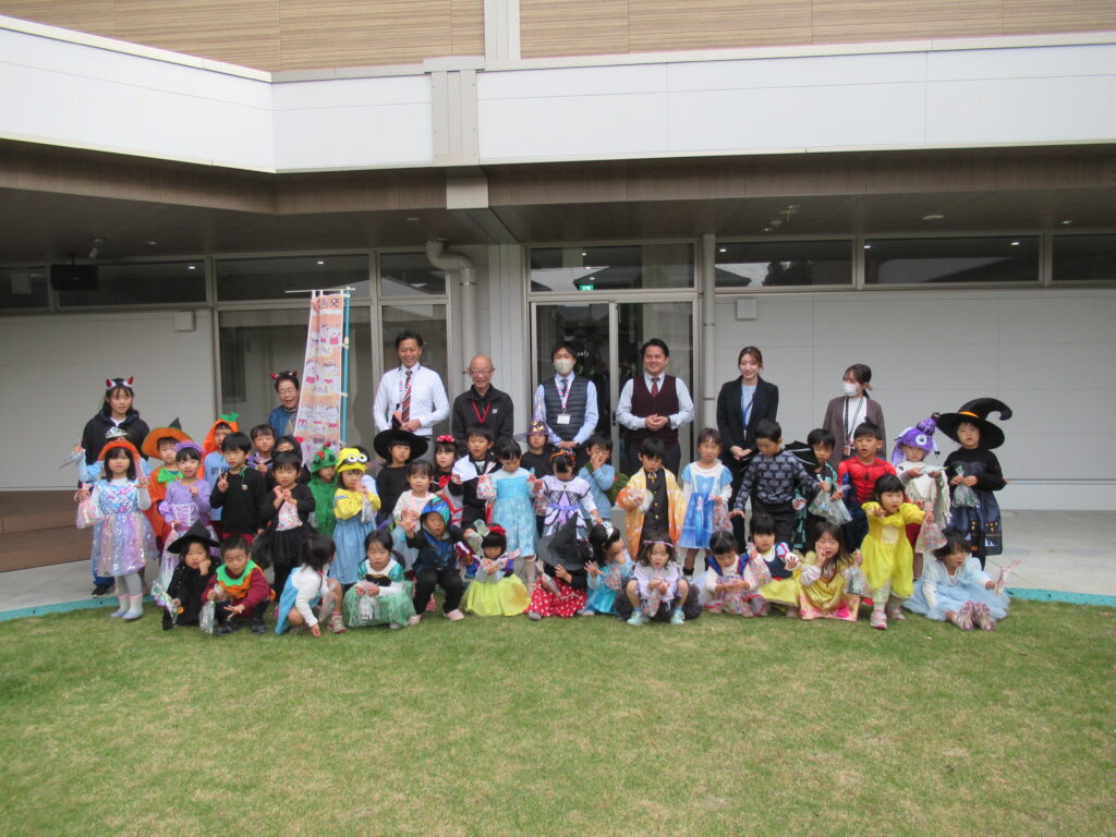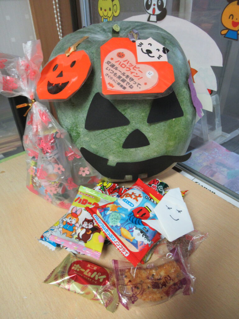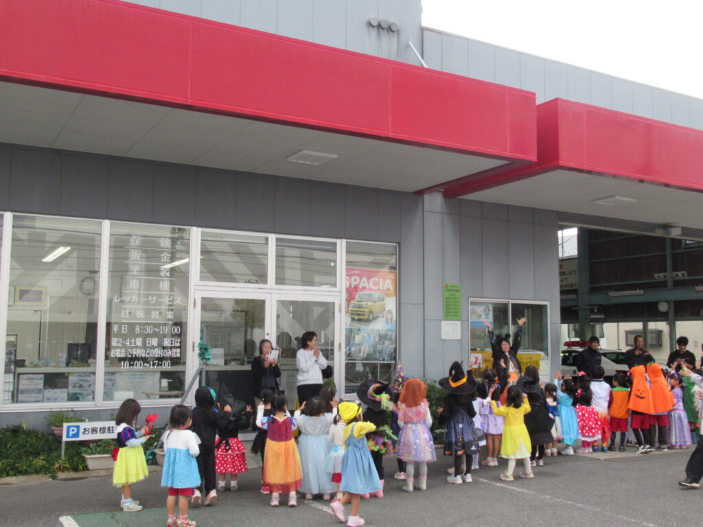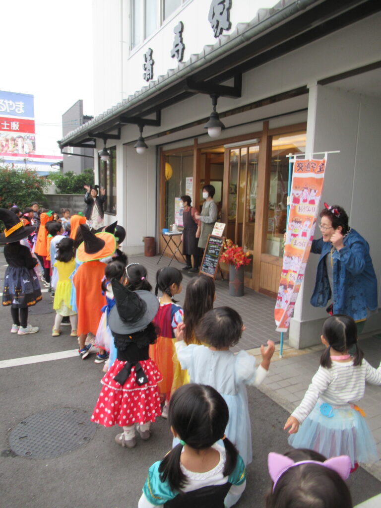 今日は、ハロウィンの仮装を楽しみながら、交通安全の大切さを伝える「交通安全啓発パレード」を行いました。子どもたちは、家から持ってきたお気に入りの仮装を身につけ、清寿家・トヨタカローラ・ヤサカ自動車・市役所・アルプラザ近江八幡・さくらの樹保育園をまわりました。道中では、「交通ルールを守りましょう」「交通ルールを守らなきゃいたずらするぞ」と元気いっぱいに呼びかけ、かわいらしいダンスも披露しました。手作りの啓発カードを手渡しし、皆さんからたくさんの笑顔と「かわいいね。えらいね。」といった温かい言葉をいただきました。午後からは5歳児超リーダーがデイサービスツクイを訪問しました。