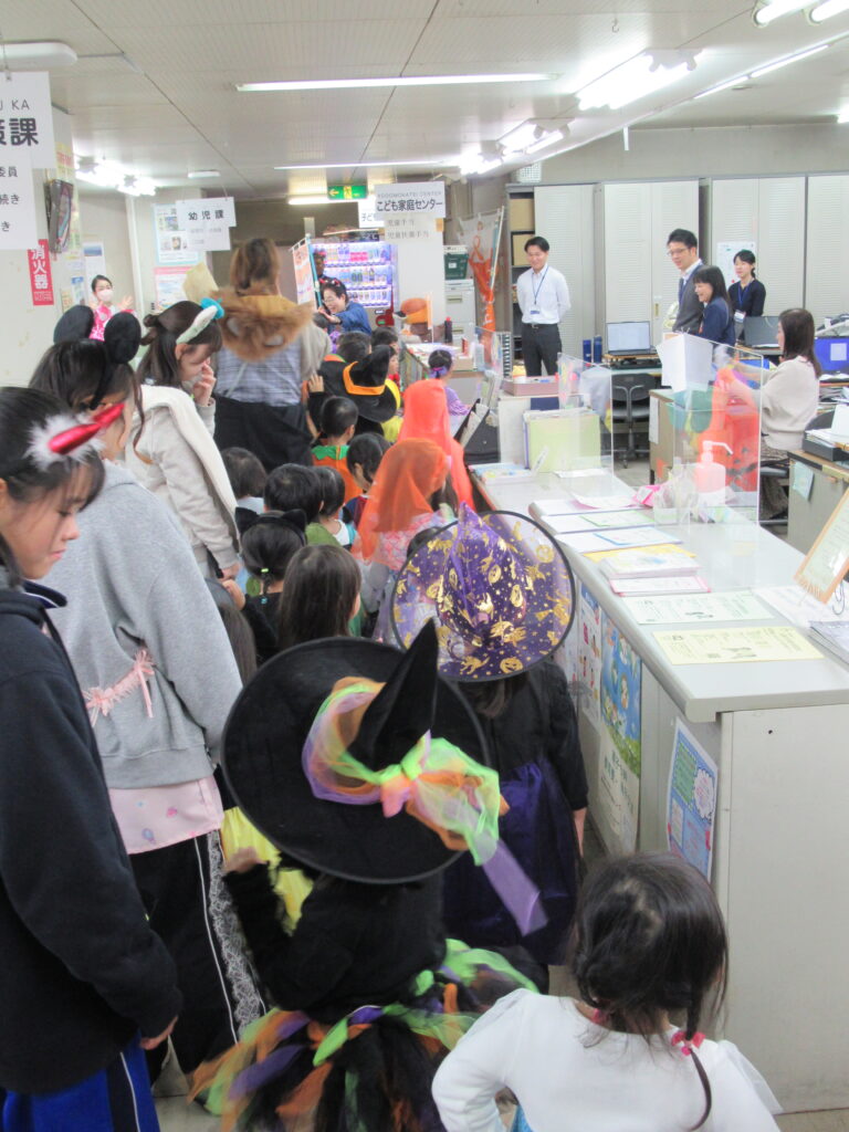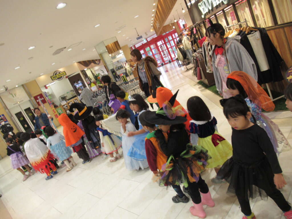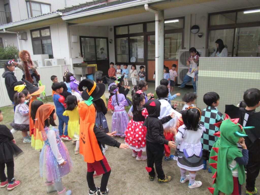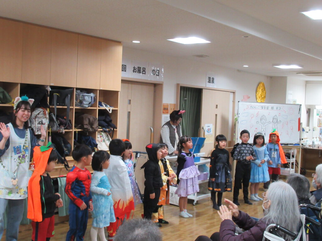 今日は、ハロウィンの仮装を楽しみながら、交通安全の大切さを伝える「交通安全啓発パレード」を行いました。子どもたちは、家から持ってきたお気に入りの仮装を身につけ、清寿家・トヨタカローラ・ヤサカ自動車・市役所・アルプラザ近江八幡・さくらの樹保育園をまわりました。道中では、「交通ルールを守りましょう」「交通ルールを守らなきゃいたずらするぞ」と元気いっぱいに呼びかけ、かわいらしいダンスも披露しました。手作りの啓発カードを手渡しし、皆さんからたくさんの笑顔と「かわいいね。えらいね。」といった温かい言葉をいただきました。午後からは5歳児超リーダーがデイサービスツクイを訪問しました。