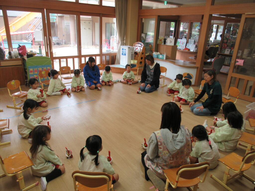 ↑さくらんぼ組(3歳児) 片手に鈴、片手に鳴子を持って床に立ててみました!バランスとることに真剣!その後は楽しくリズム遊びをしました(^^)/