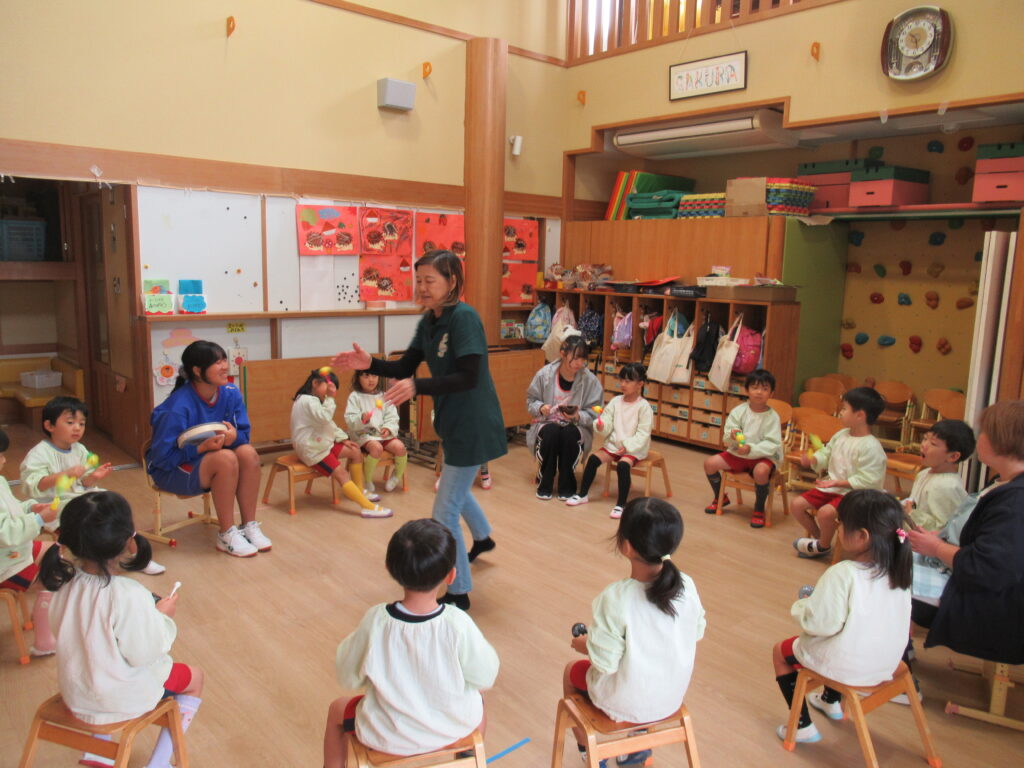 ↑さくら組(4歳児)リーダー 初めてのミニ木魚に挑戦!太鼓をリズムに合わせてたたいていくパンパン遊びも、工夫して楽しめました😉