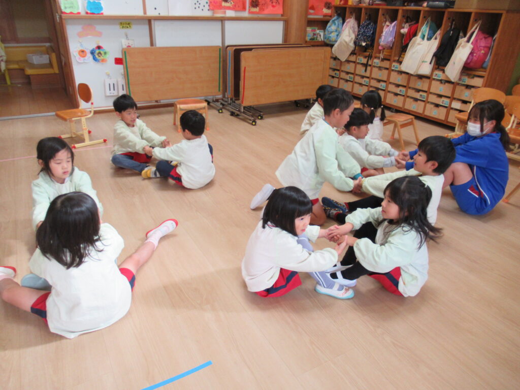 ↑さくら組(5歳児)超リーダー 友だちとペアになり、ふれあいあそびやオーガンジーを使って楽しみました。息を合わせてユラユラ~♫